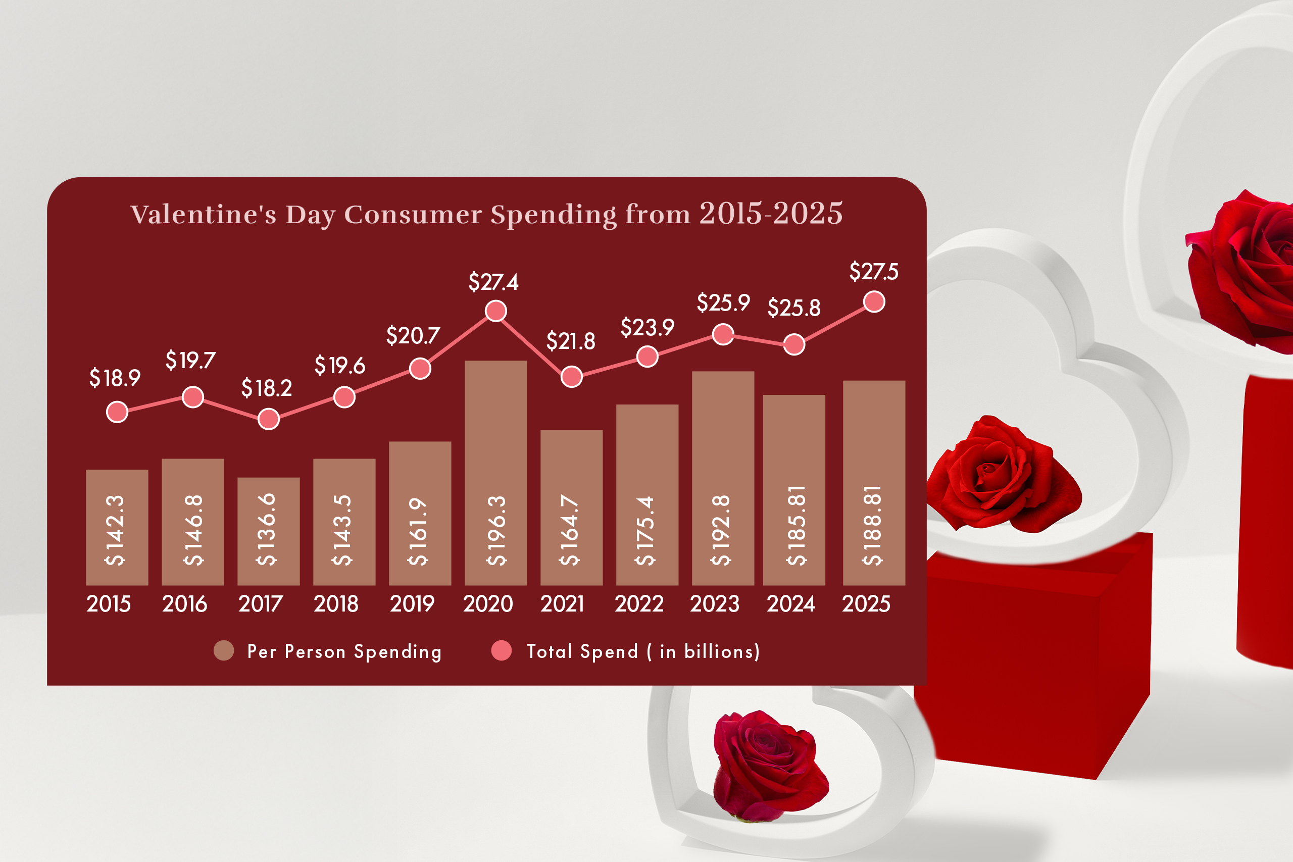 Valentine’s Day remains one of the most important holidays for consumers, and 2025 proved that the momentum isn’t slowing down. According to the annual survey by the National Retail Federation (NRF), Valentine’s Day spending reached a record $27.5 billion. That number is much higher than the prior year’s $25.8 billion and even edged out the previous high set in 2020.