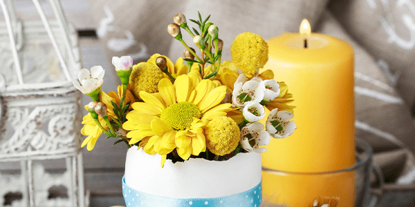 Flowers brighten any holiday, and this charming Easter arrangement is no exception. Its unique goose eggshell container adds a touch of whimsy to any tabletop.
