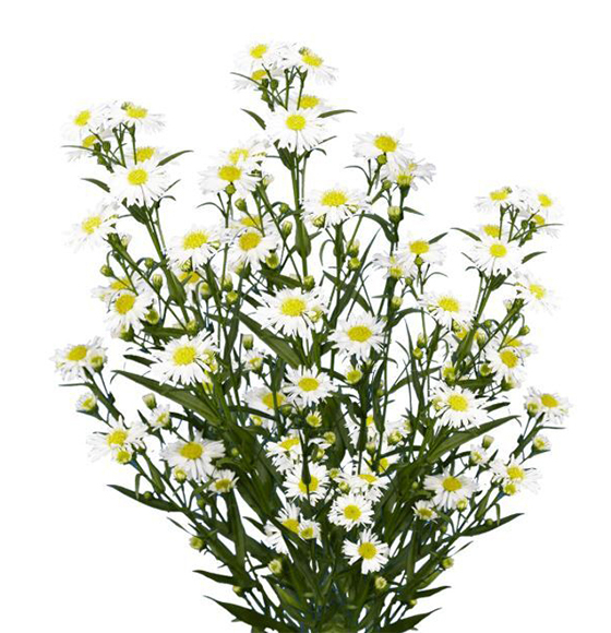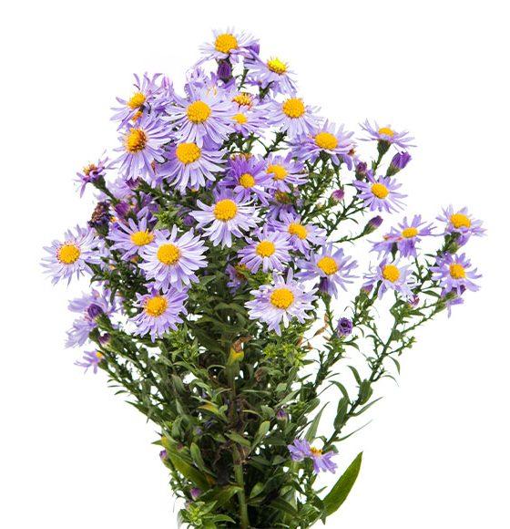 Asters resemble miniature daisies, since their ray petals contain the primary color and the centers are usually yellow. Hundreds of small, papery flowers are spread along laterals that branch off the main stem. Due to their wispy and delicate nature, asters lend a soft, garden-like feel to arrangements.