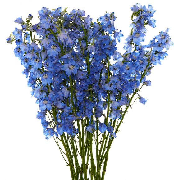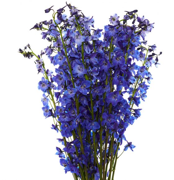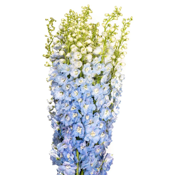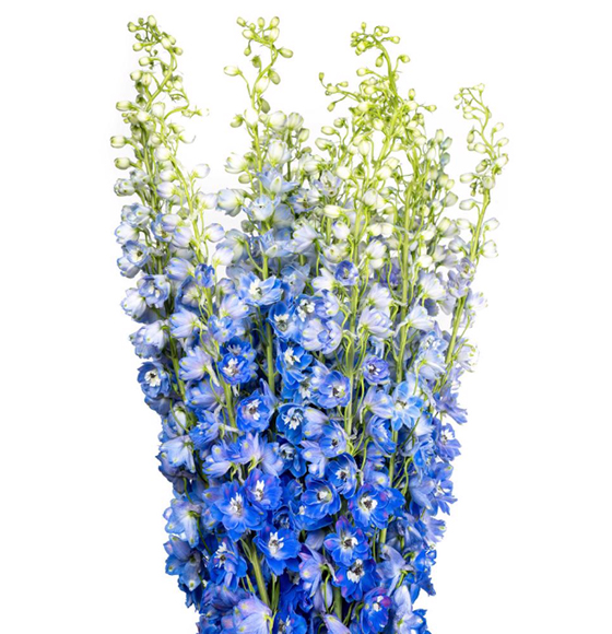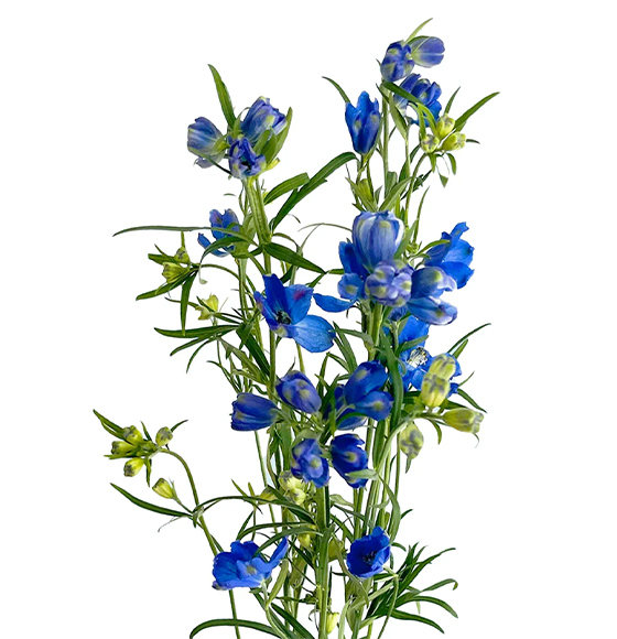 Rio delphinium is truly unique, thanks to its exceptionally long vase life and minimal shedding, achieved through a special postharvest process we use. Rio specializes in growing Sea Waltz in dark blue and light blue, as well as hybrid delphinium in white, lavender, light blue, dark blue, and spray blue delphinium. The gorgeous blooms encircle the sturdy stem, creating the appearance of a soft floral spike. When viewed from the side, the blossoms are said to resemble a dolphin, hence the name “delphin,” derived from the Greek word for dolphin.